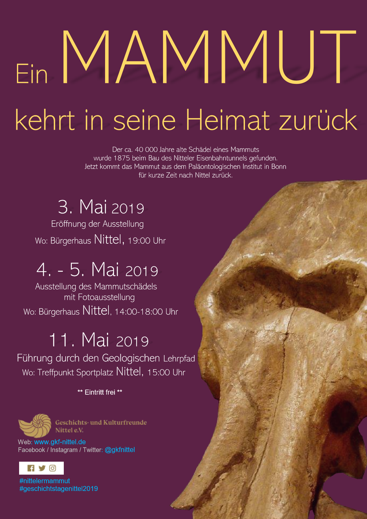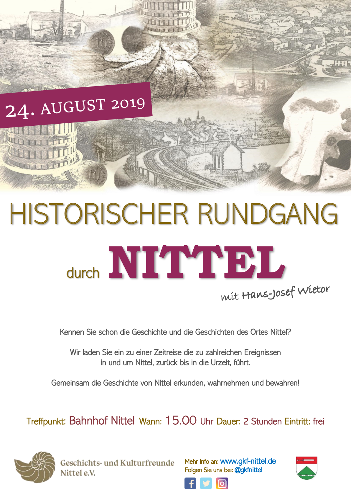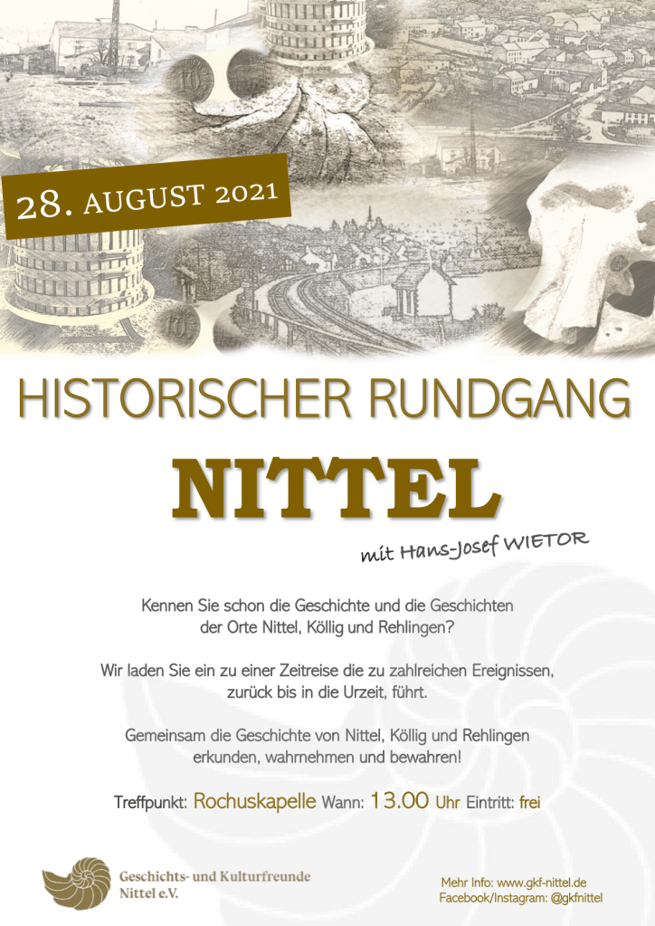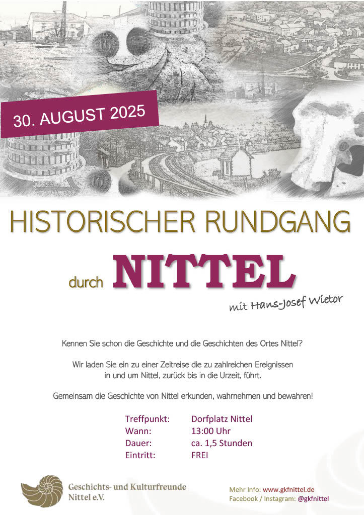 Auch in diesem Jahr und damit schon zum 7. Mal, hatte der Verein der Geschichts- und Kulturfreunde Nittel e.V. wieder zu einem Historischen Rundgang, zu einer Zeitreise durch die Geschichte, eingeladen. Bei Sonnenschein und angenehmen Temperaturen nutzten 15 Teilnehmer diese Möglichkeit, um mit Spaß und Freude die Geschichte von Nittel zu entdecken.
