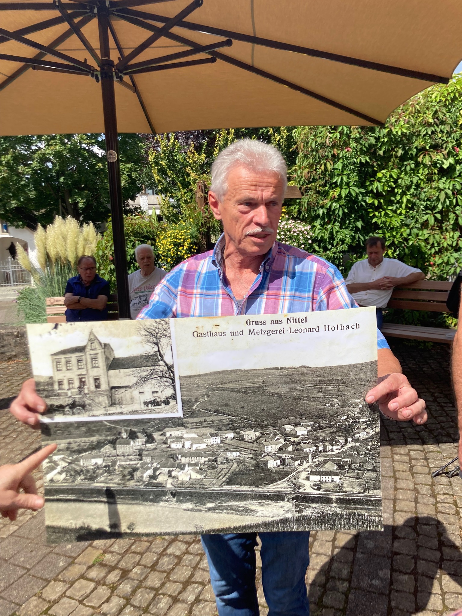 Um das Erzählte sichtbar werden zu lassen wurden Vergrößerungen von besonderen historischen Fotos gezeigt. So konnten sich die Teilnehmer einen Eindruck davon machen, wie z.B. die Straßen und Gebäude vor 100 Jahren und auch nach dem II. Weltkrieg in Nittel aussahen.