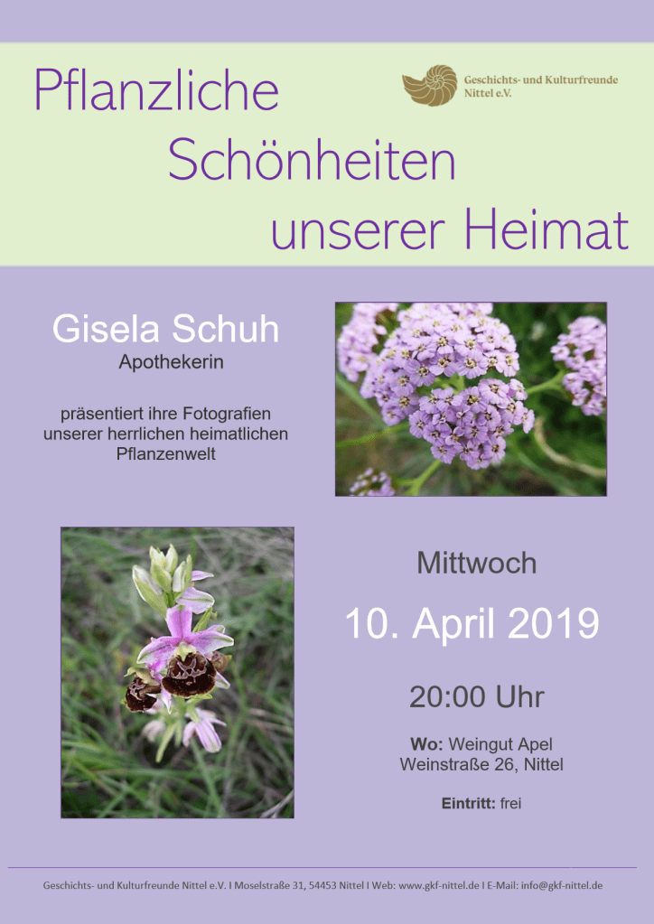 Mehr als 50 Wildblumen und blühende Sträucher konnten die Zuhörer im Weingut Apel am 10.04.2019 kennenlernen. Gisela Schuh führte die faszinierten Anwesenden mit ihren wunderschönen Fotos und ihrem reichen Wissen auf eine Blütenreise durch einen ganzen Jahreskreislauf und man wünschte, das Jahr hätte noch mehr Monate. (cb)