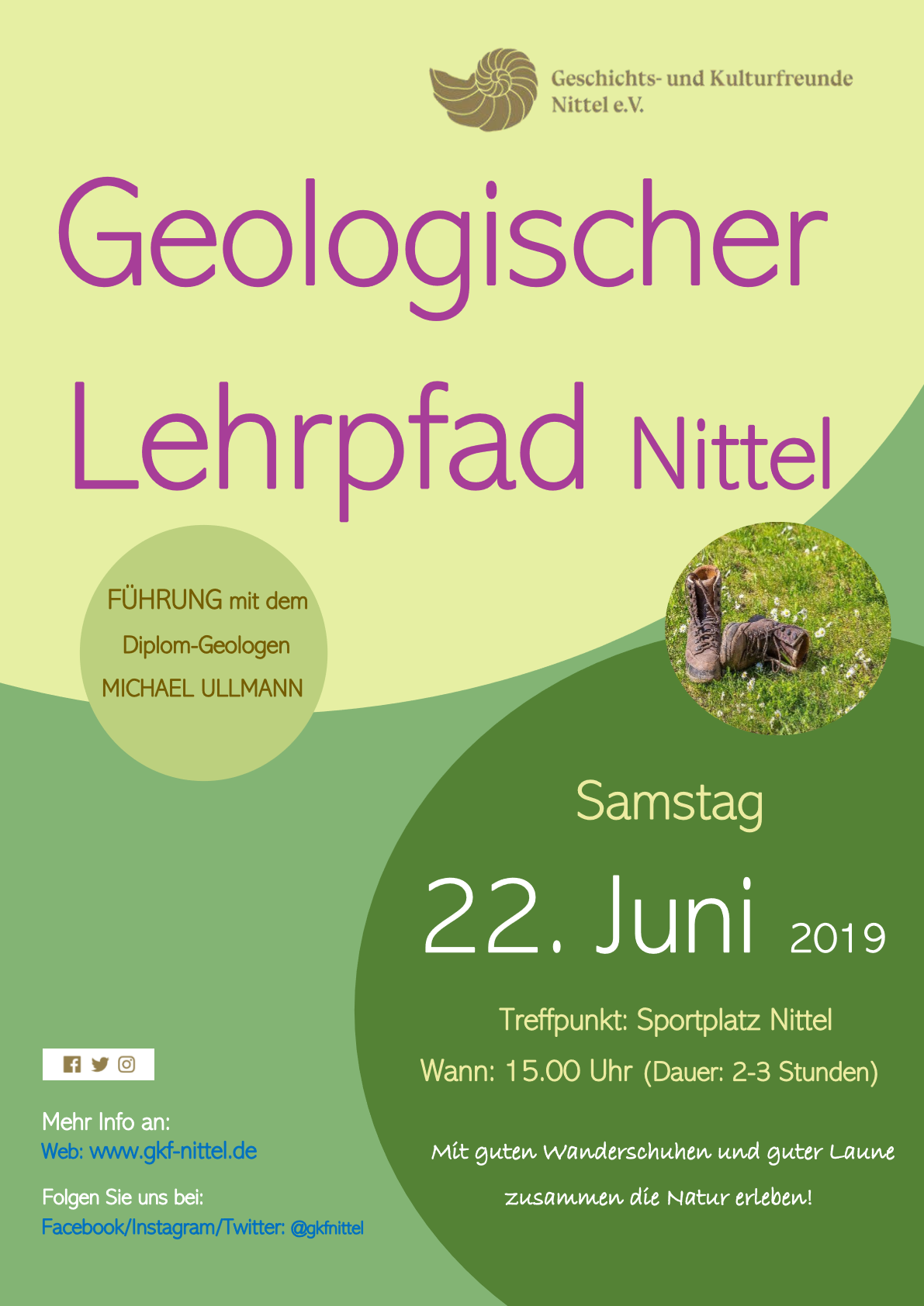 Der vielbeachtete Lehrpfad wurde 2013 eröffnet. Er bietet an insgesamt 15 Standorten im Bereich der Ortsgemeinden Nittel, Wellen und Machtum (Luxemburg) viele Neuigkeiten über die geologisch Entwicklung der wunderschönen Landschaft an der Obermosel / südlichen Weinmosel. Themen sind u.a. Pflanzen im Naturschutzgebiet „Nitteler Fels“ sowie Böden, Muschelkalk, Kiese, die Gipsherkunft und nicht zuletzt das Mammut, das durch die Ausstellung des Vereins im Mai 2019 im Nitteler Bürgerhaus viele Interessenten anlockte und in Erstaunen versetzte.
