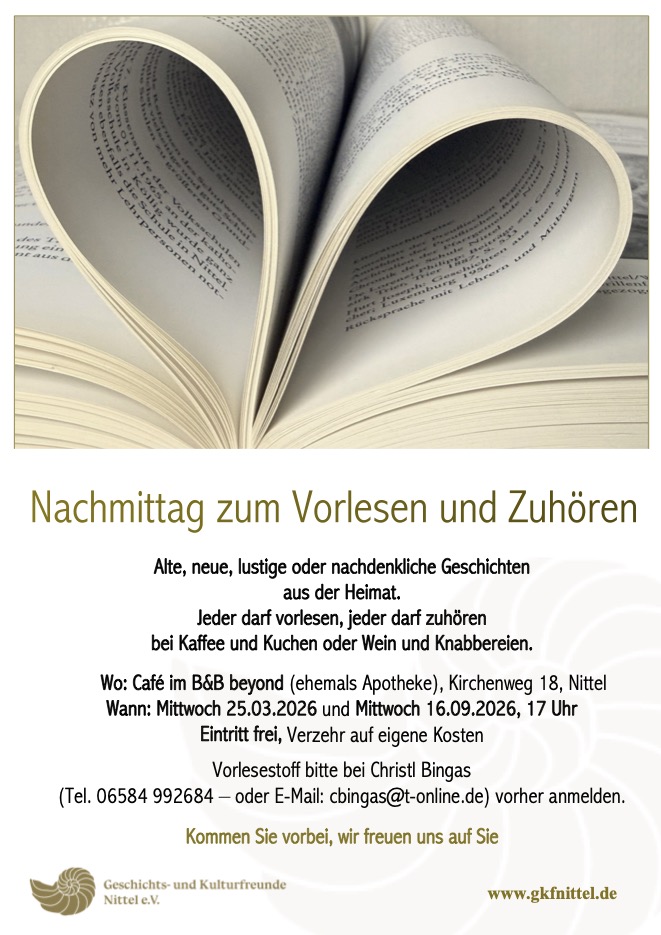 Es war ein sehr gemütlicher Nachmittag mit Vorlesen und Zuhören im gemütlich eingerichteten Beyond Café in der alten Apotheke in Nittel, als Start einer neuen Veranstaltungsreihe der Geschichts- und Kulturfreunde e.V. Nittel.